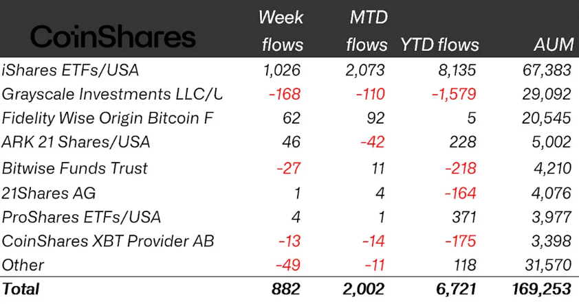 According to CoinShares, crypto fund inflows were again highly concentrated in BlackRock’s iShares products, which saw $1 billion of inflows last week.