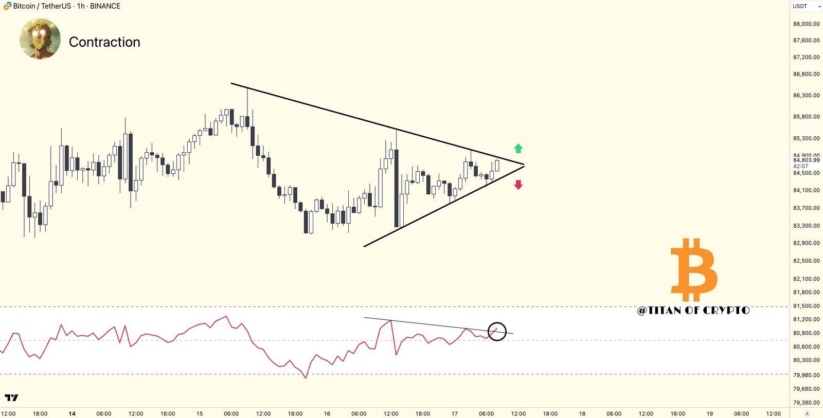 “Bitcoin Inflection Point. On the 1H chart, BTC is contracting within a triangle and is about to choose a direction. The RSI is above 50 and attempting to break its resistance. A move is brewing.”