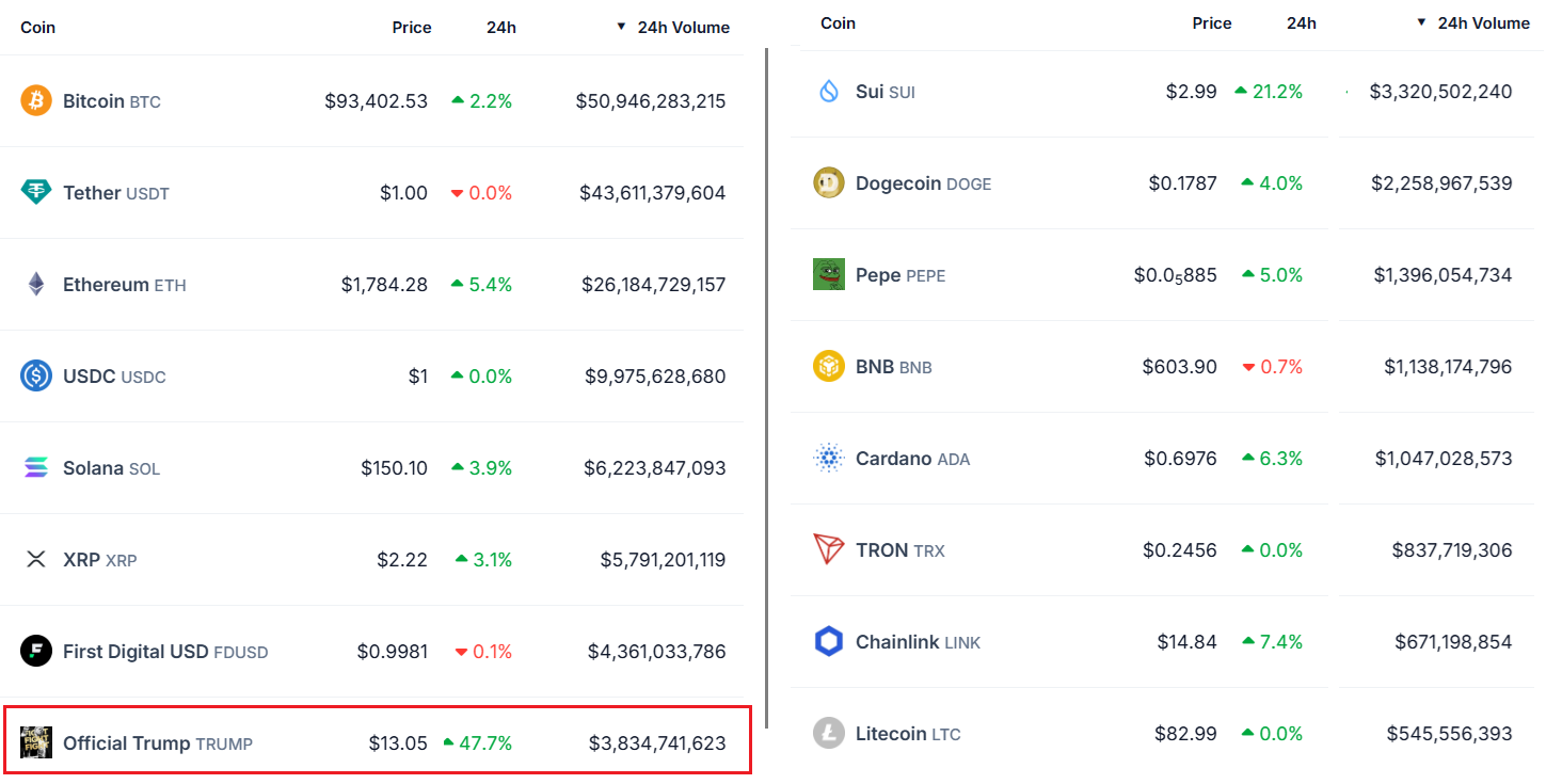 Even though TRUMP is currently trading 84% below its all-time high, it remains a top-10 token in terms of volume. In fact, excluding the stablecoins, only 4 cryptocurrencies surpassed TRUMP’s impressive $3.84 billion 24-hour turnover, according to CoinGecko data.