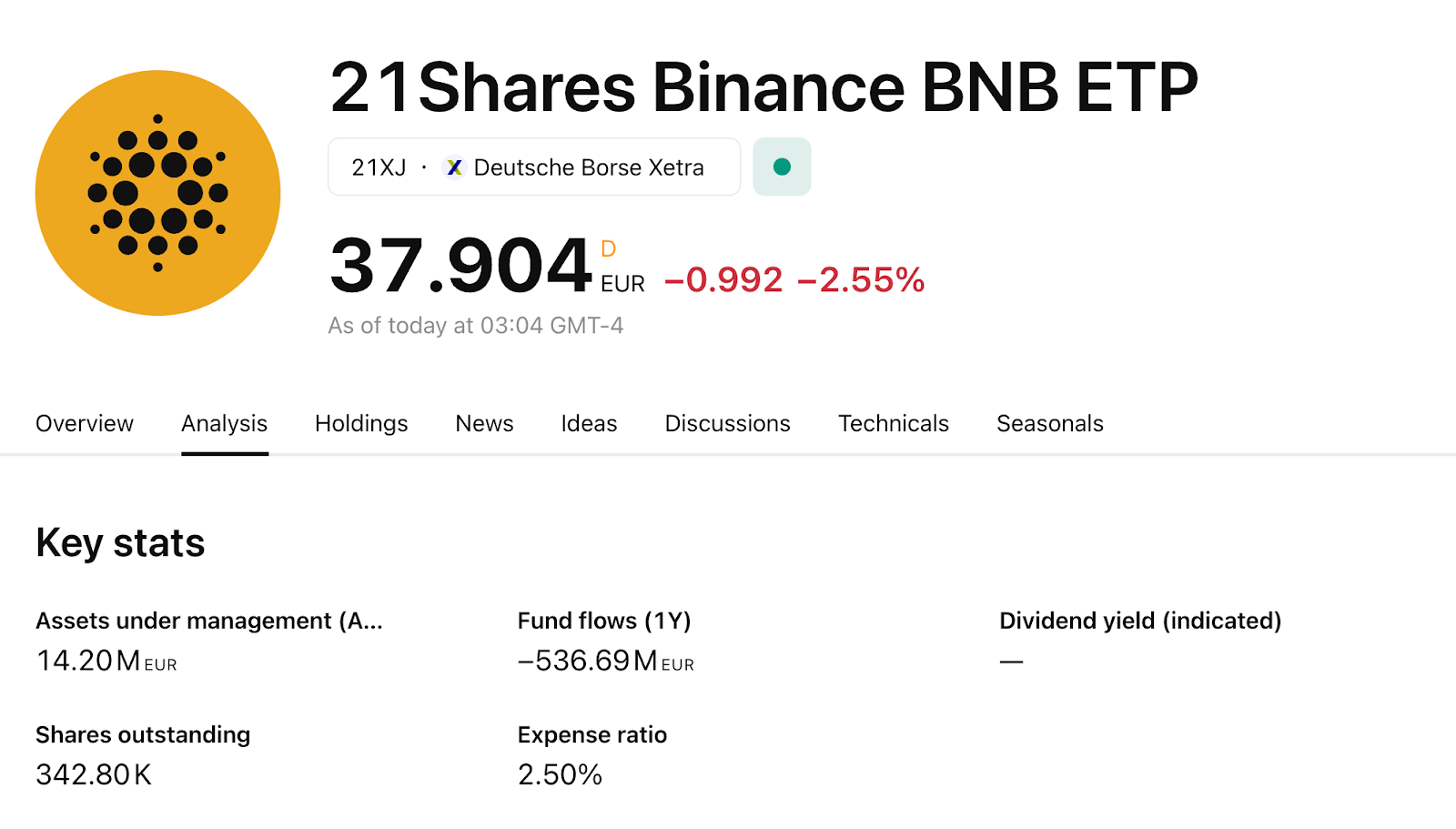Prominent European crypto asset manager 21Shares launched a BNB exchange-traded product (ETP) in Switzerland in October 2019, according to TradingView.