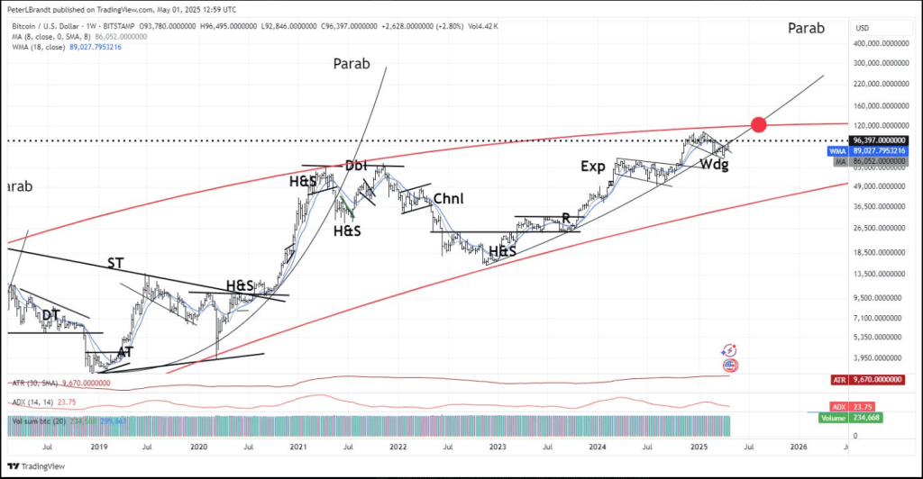 If Bitcoin can regain the broken parabolic slope then $BTC is on target to reach the bull market cycle top in the $125k to $150K level by Aug/Sep 2025, then a 50%+ correction pic.twitter.com/WUUzxl0ckn— Peter Brandt (@PeterLBrandt) May 1, 2025