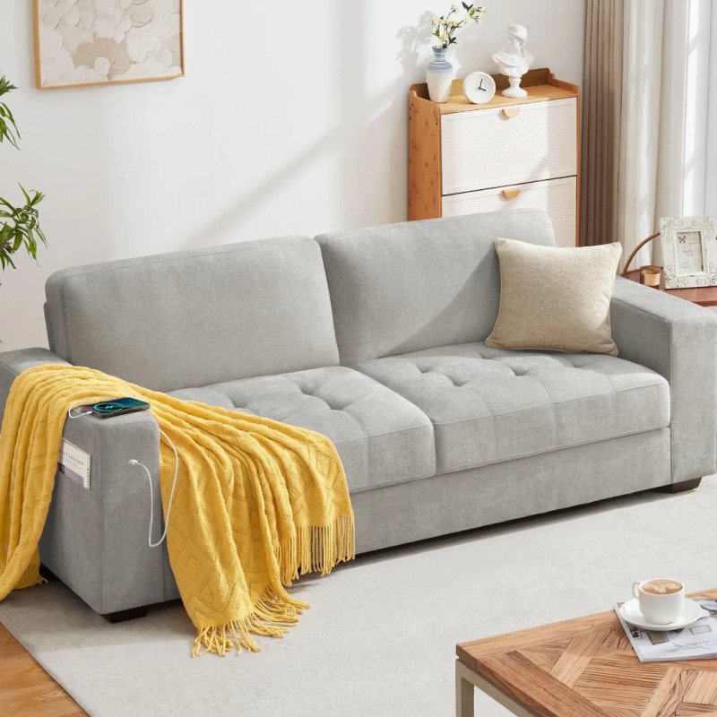 Tufted lower cushions offer a touch of depth and dimension to the overall look, and wide armrests add to the overall comfort. The sofa’s solid wood construction makes it durable and stable, while still being lightweight enough to move as needed. The cherry on top is that the sofa has two outer pockets for storage and a USB port in the armrest.