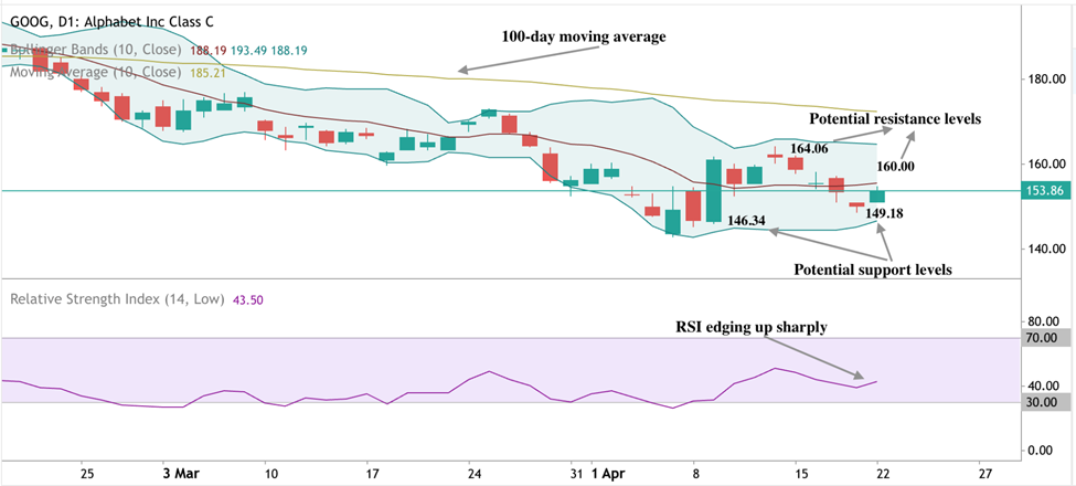 At the time of writing, Google stock is hovering around the $153.86 mark. Prices remain below the moving average, indicating that the trend is still downwards. However, RSI rising steadily indicates that some upside pressure is building. Should the downward trend continue, prices could find support around the $149.18 and $146.34 support levels.