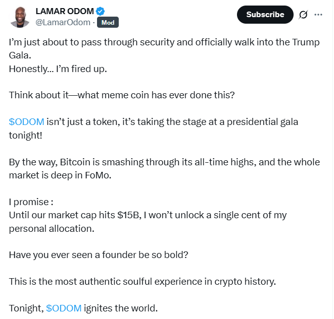 Also in attendance was two-time National Basketball Association champion Lamar Odom. While many other crypto entrepreneurs in the audience were focused on policy, Odom used news of his attendance to plug his own memecoin, ODOM.