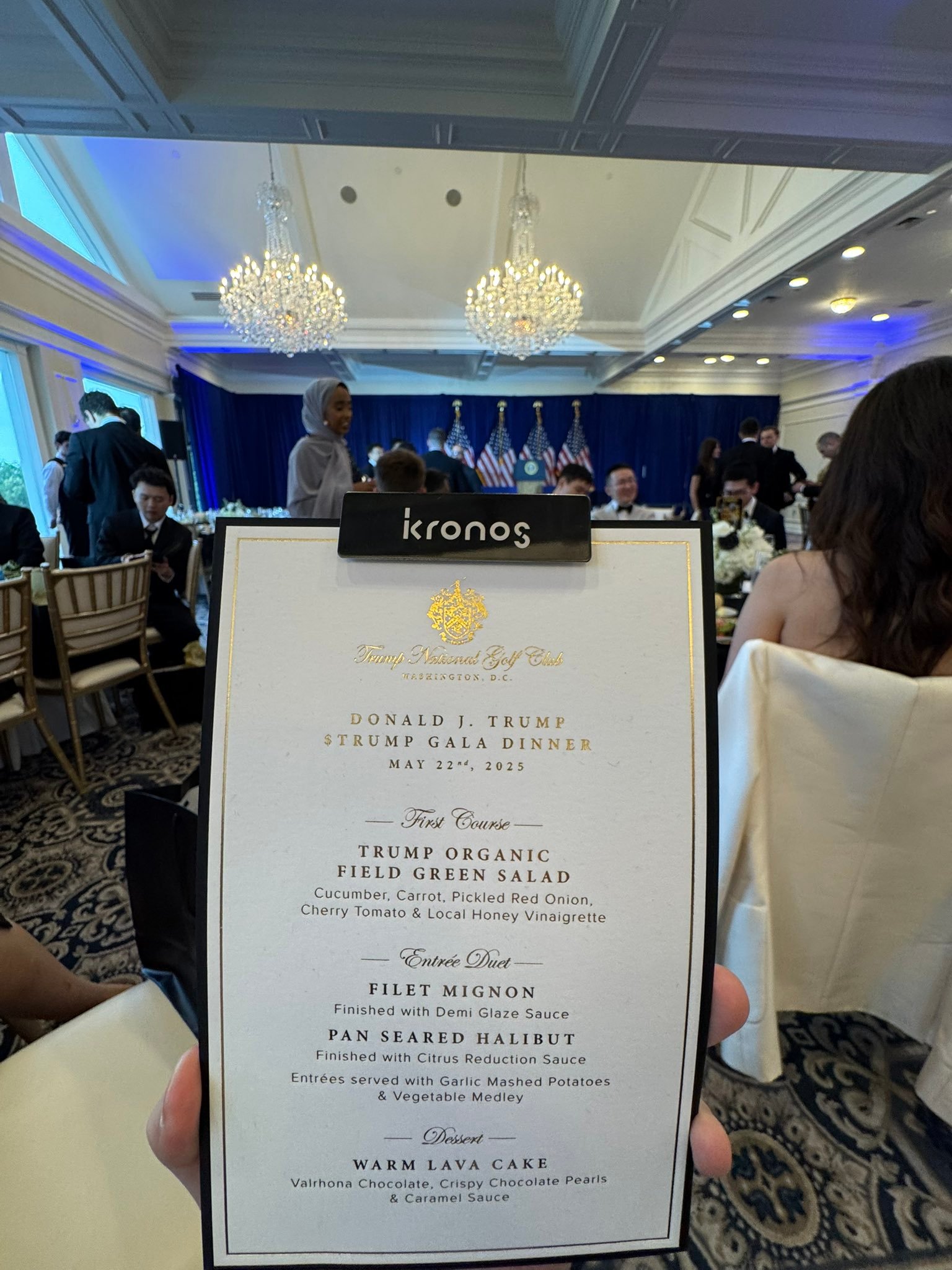 Vincent Liu, chief investment officer of crypto trading, VC and market-making firm Kronos Research, attended the event, posting pictures of the menu and Trump’s brief speech.