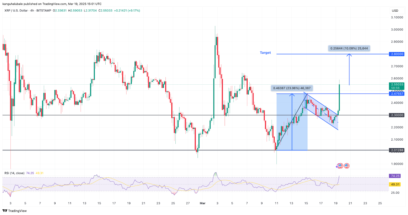 The maximum profit target from the pole’s length indicates that XRP could revisit the $2.80 level over the next few hours.