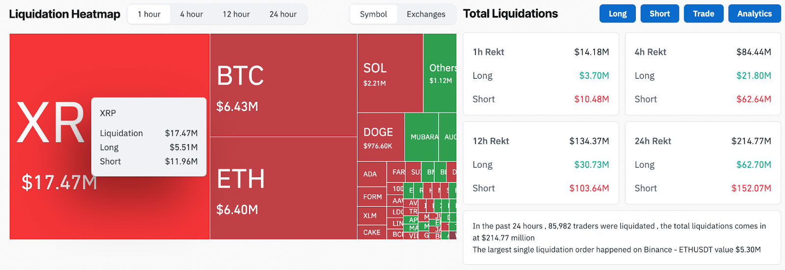 Over $11.96 million worth of short XRP positions have been liquidated over the last hour alone, compared to $5.5 million in long liquidations.