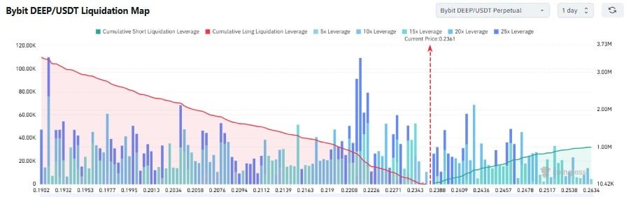 Alternatively, leveraged long traders positioned at $0.2217 may risk liquidation if DEEP falls to the $0.22-price level. This would intensify selling pressure until $0.21 and potentially, even lower.