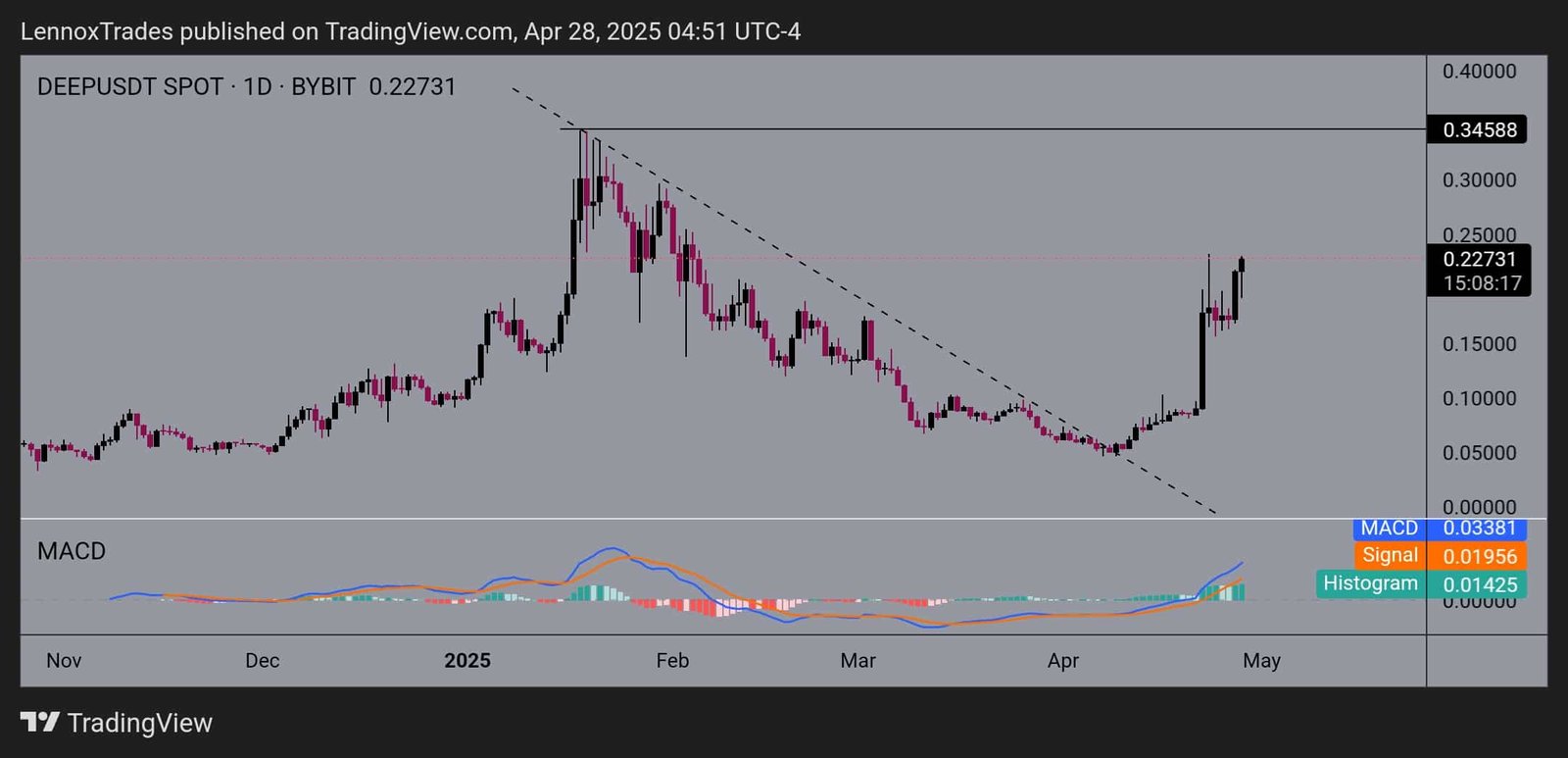 Now, DEEP has the chance to revisit its previous all-time high of $0.34588, provided its press time momentum remains strong. The market would likely accelerate to $0.34–$0.35 if the price breaks above $0.23 during the ongoing bullish phase.