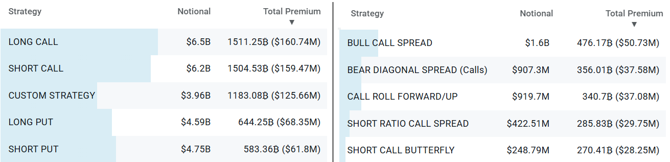 Among the most significant option strategies traded at Deribit in the past two weeks is the “short call,” which is often used by investors seeking a fixed-income return as long as Bitcoin’s price stays above a particular threshold. Similarly, the “bull call spread” strategy hedges against downside risk by sacrificing gains above a certain price.