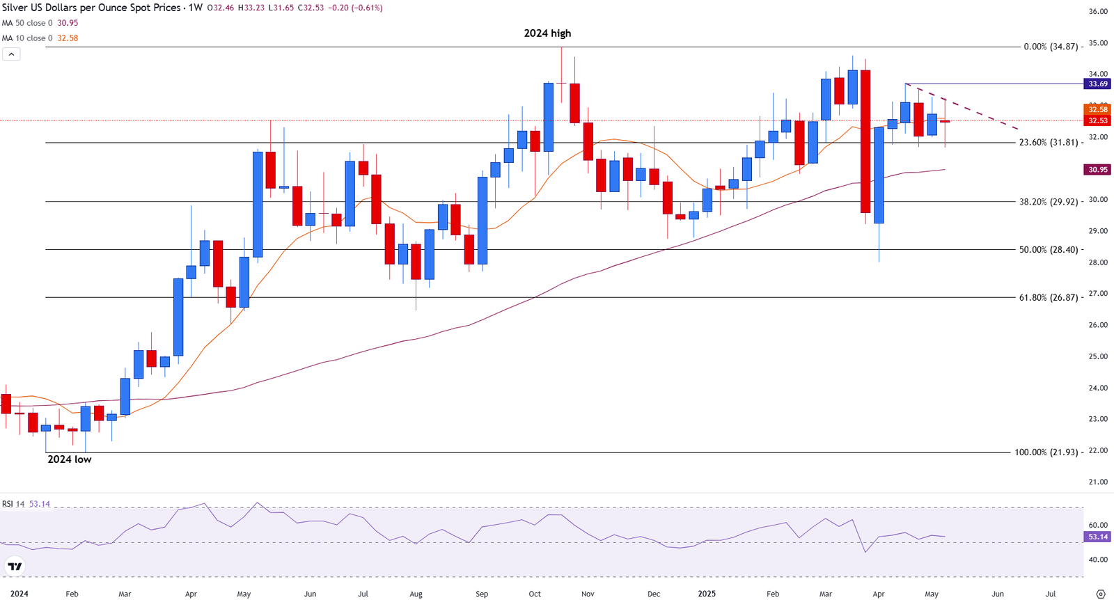 The 10-week and 50-week SMAs, positioned at $32.57 and $30.95, respectively, are gradually converging, indicating a tightening technical structure. The Relative Strength Index (RSI) on the weekly chart is at 52.75, reflecting a mildly bullish bias but no strong momentum either way. A sustained breakout above $33.69 or a confirmed close below $31.80 would likely determine the next directional move for Silver.