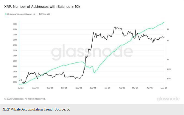 Meanwhile, as XRP’s price remains stagnant, the large holders are filling up. According to recent statistics, there are now more than 300,000 addresses holding a minimum of 10,000 XRP. That’s an increase from around 281,000 as of December 2024. Whale wallets continue to rise even though the price remains largely flat around $2.20.
