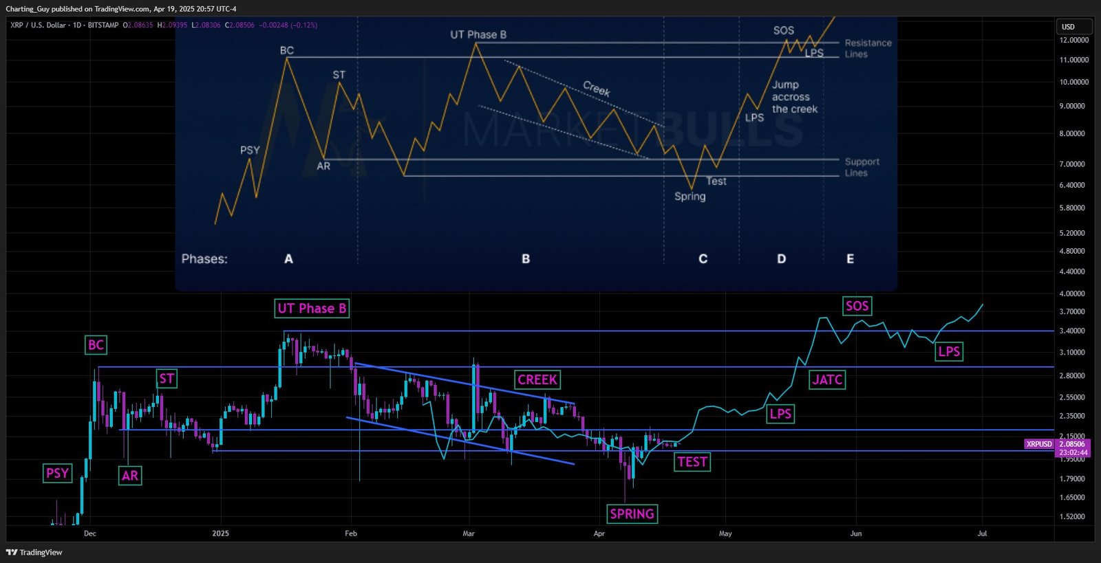 XRP established support and began consolidating in late 2024, marking Phases A and B of the Wyckoff reaccumulation pattern. In early April 2025, the price formed a “Spring” followed by a successful “Test,” signaling seller exhaustion.