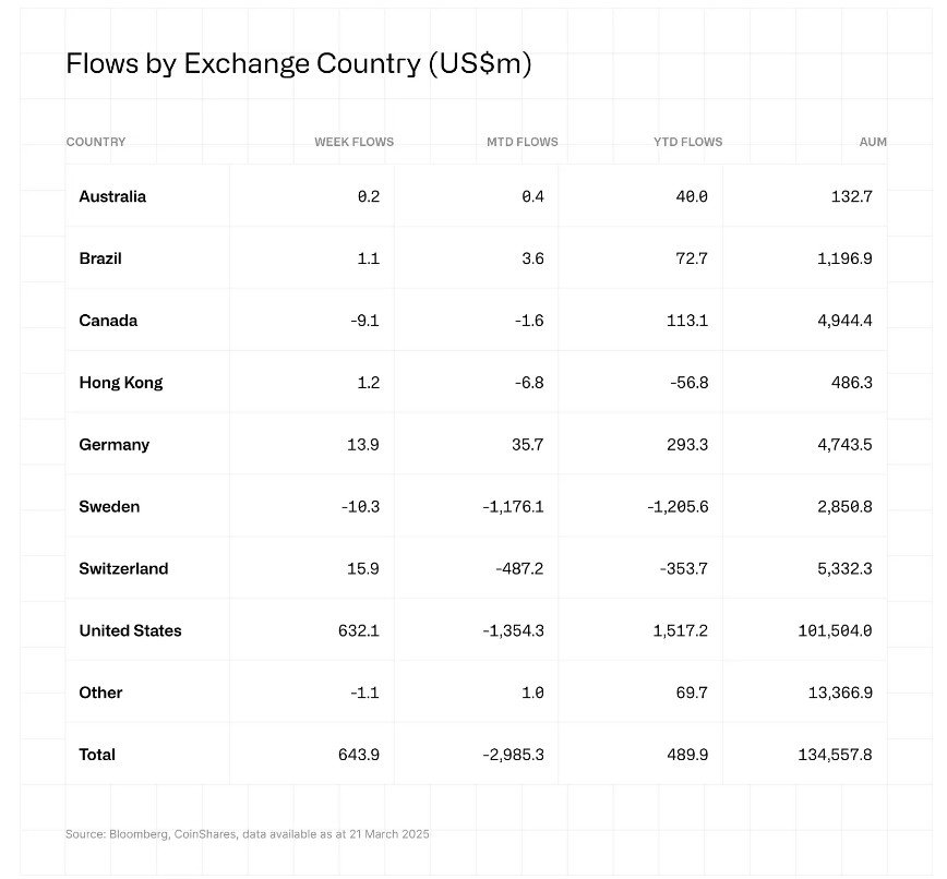 Canada and Sweden lead outflows. Source: CoinShares