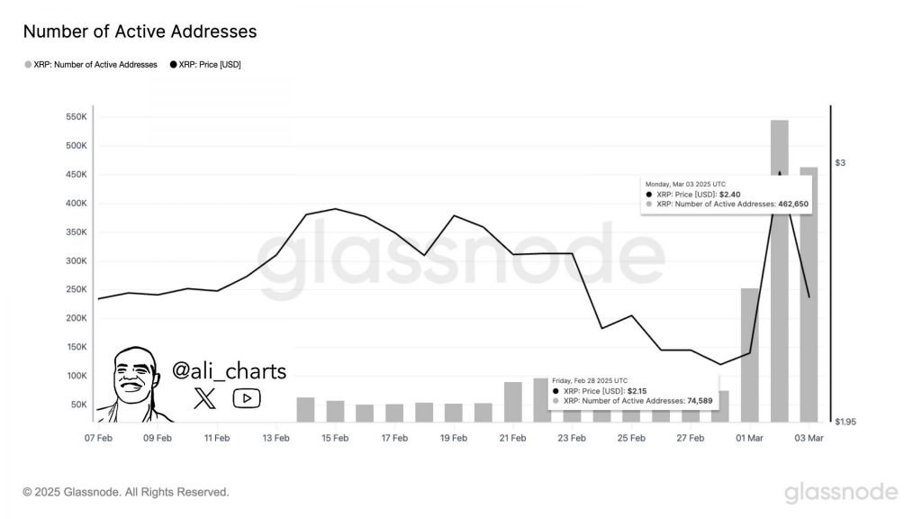 The chances of XRP moving past $4 could seem unreasonable at the moment. But the cryptocurrency market has time and again revealed what its volatile nature can do. But for the asset to reach this level, several factors must come into play. Currently, the network activity of XRP was seen rising. Analyst Ali Martinez highlighted that in the last week, the number of active XRP addresses has increased from 74,589 to 462,650. This represents a 620% increase which is a highly bullish sign.